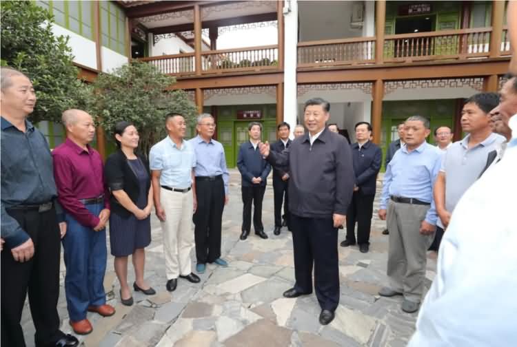 2019年9月16日下午,习近平在位于河南省信阳市新县的鄂豫皖苏区首府革命博物馆,同当地红军后代、革命烈士家属代表亲切交谈。