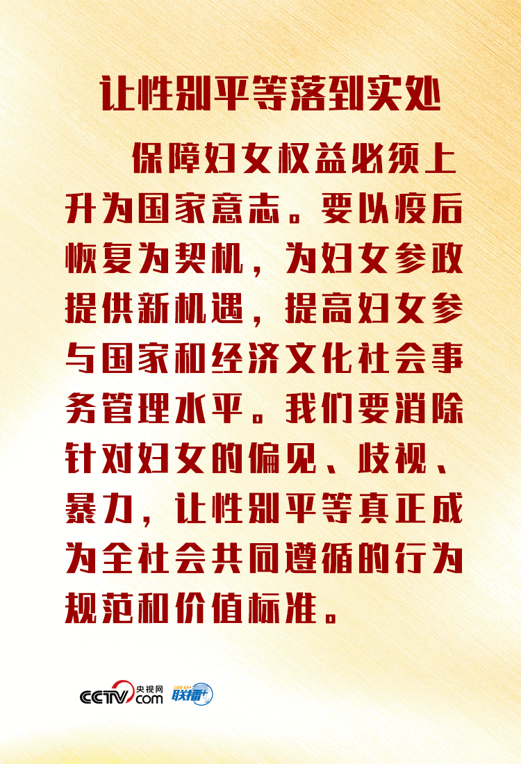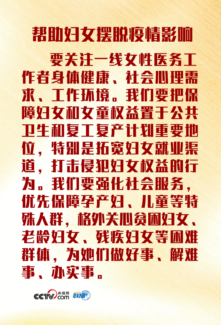新冠肺炎疫情还在全球蔓延,对各国生产生活、就业民生带来了严重冲击,妇女面临更大挑战。习近平主席在讲话中强调,在我们抗击疫情和推动经济社会复苏进程中,尤其要关注妇女特殊需要,并提出四点主张,为加快实现性别平等、促进全球妇女事业发展提供“中国方案”。