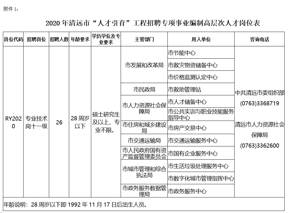 1.2020年清远市人才引育工程招聘专项事业编制高层次人才岗位表