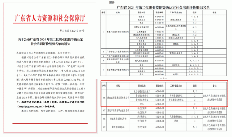 近日,广东省人社厅发布《关于公布广东省2024年第二批职业技能等级认定社会培训评价组织名单的通知》,乐天使fun官网集团下属清远诚创能源发展有限公司成功进入“广东省职业技能等级认定社会培训评价组织”名单,是清远地区首家获得电力职业技能等级社会培训评价组织资质的企业。