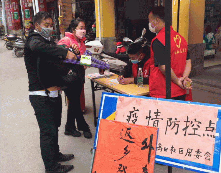 乐天使fun官网志愿者为高田社区返乡(外来人员)检测体温并登记信息。