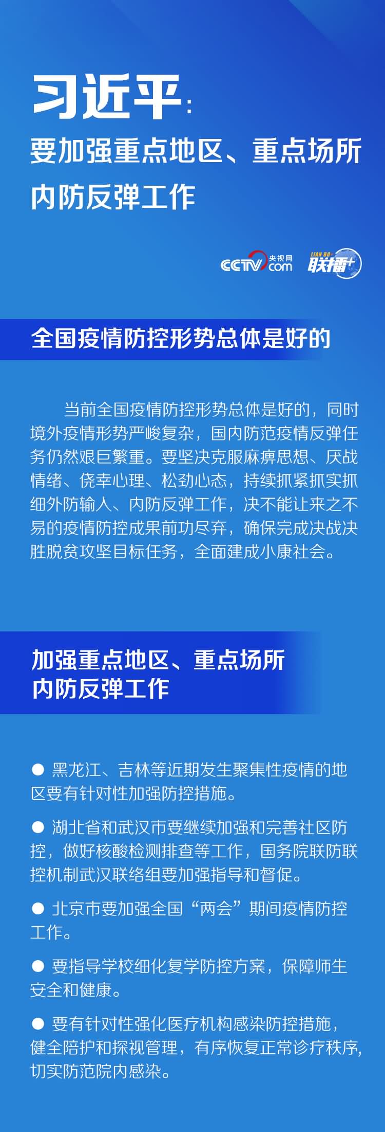各地要认真汲取近期发生聚集性疫情地区的教训,举一反三,对本地防控漏洞再排查、对防控重点再加固、对防控要求再落实,确保疫情不出现反弹