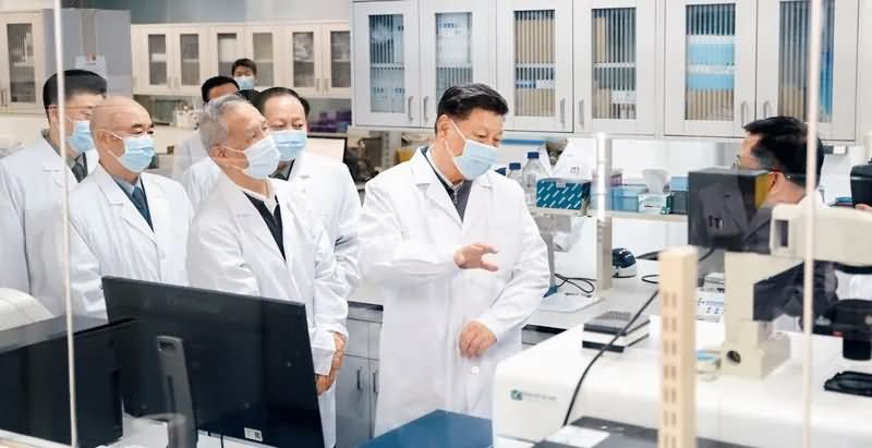 2020年3月2日,中共中央总书记、国家主席、中央军委主席习近平在北京考察新冠肺炎防控科研攻关工作。这是习近平在军事医学研究院重大疫情应急防控药物研究室了解疫苗和抗体研制情况。