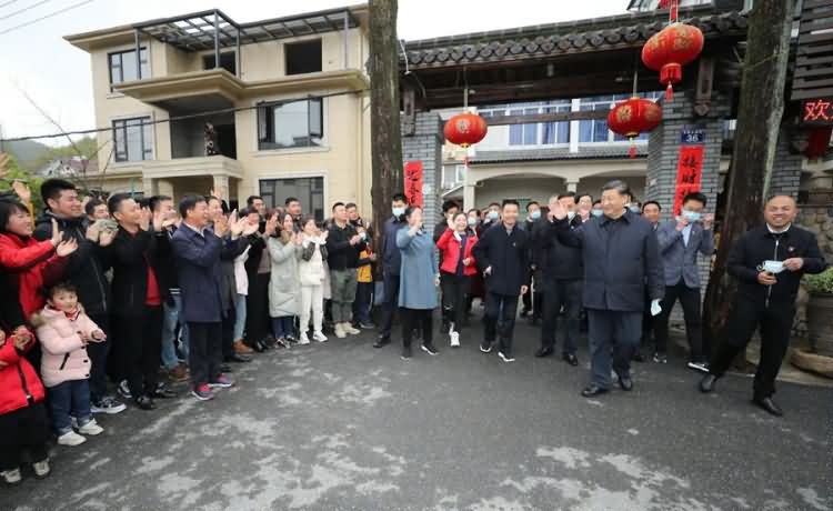 2020年3月29日至4月1日,中共中央总书记、国家主席、中央军委主席习近平在浙江考察。这是3月30日,习近平在湖州市安吉县天荒坪镇余村考察时,向村民们挥手致意。