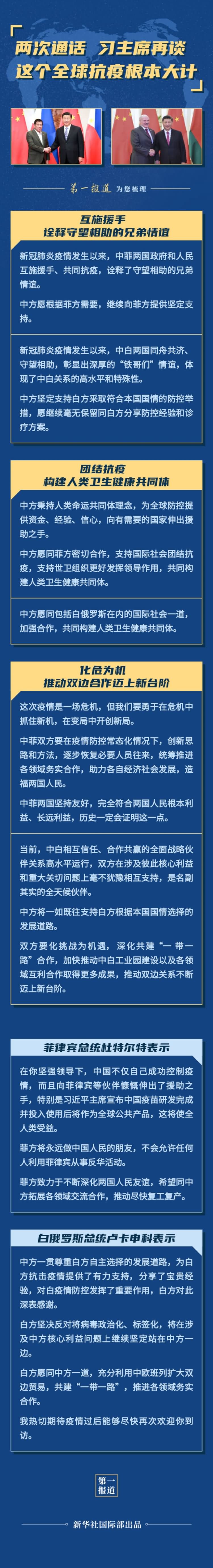 新冠疫情发生以来,习主席亲力亲为推动疫情防控国际合作,呼吁国际社会团结抗疫、共同构建人类卫生健康共同体。共同构建人类卫生健康共同体,是人类立足当前战胜新冠疫情、着眼长远应对重大公共卫生突发事件的根本大计。在11日晚同菲律宾、白俄罗斯领导人通话中,习主席再次谈到“人类卫生健康共同体”。