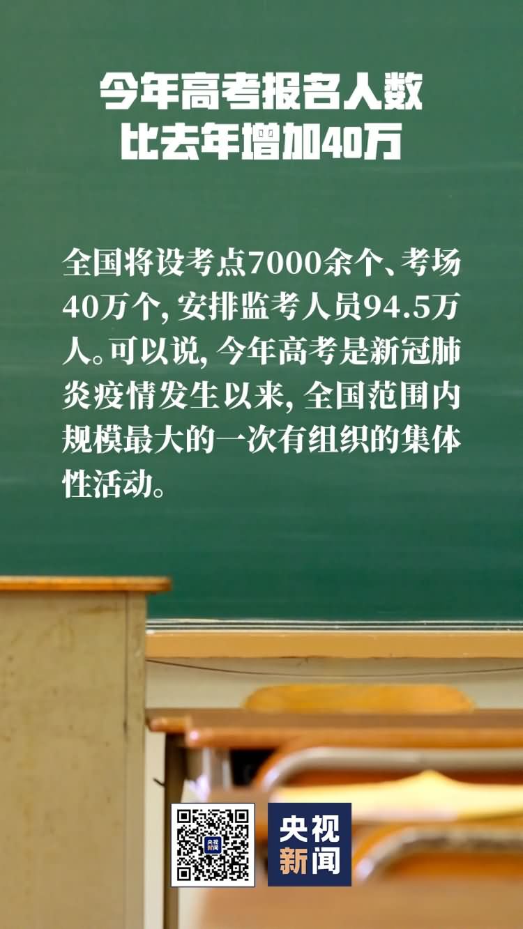 据了解,今年高考报名人数为1071万人,比去年增加40万。全国将设7000余个考点、40万个考场,安排监考人员94.5万人。今年高考是疫情发生以来,全国范围内规模最大的一次有组织的集体性活动。
