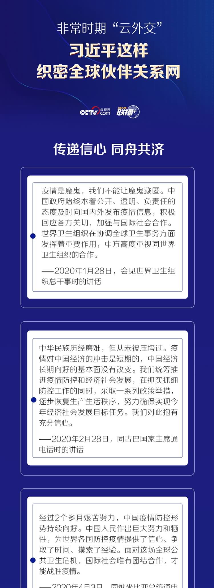 疫情发生以来,习近平主席以电话、书信、视频为主渠道,开启“云外交”模式。