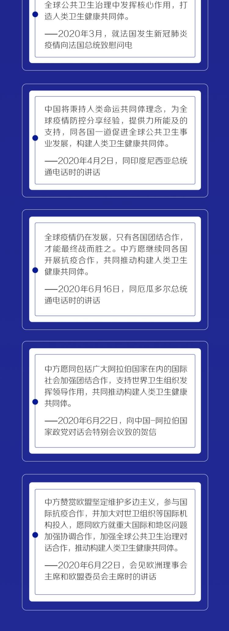 截至目前,习主席就疫情开展的“电话外交”已达60余次,出席二十国集团领导人应对新冠肺炎特别峰会,在第73届世界卫生大会视频会议开幕式上致辞,主持中非团结抗疫特别峰会并发表主旨讲话,不断向全球表明中国支持团结抗疫的鲜明立场。