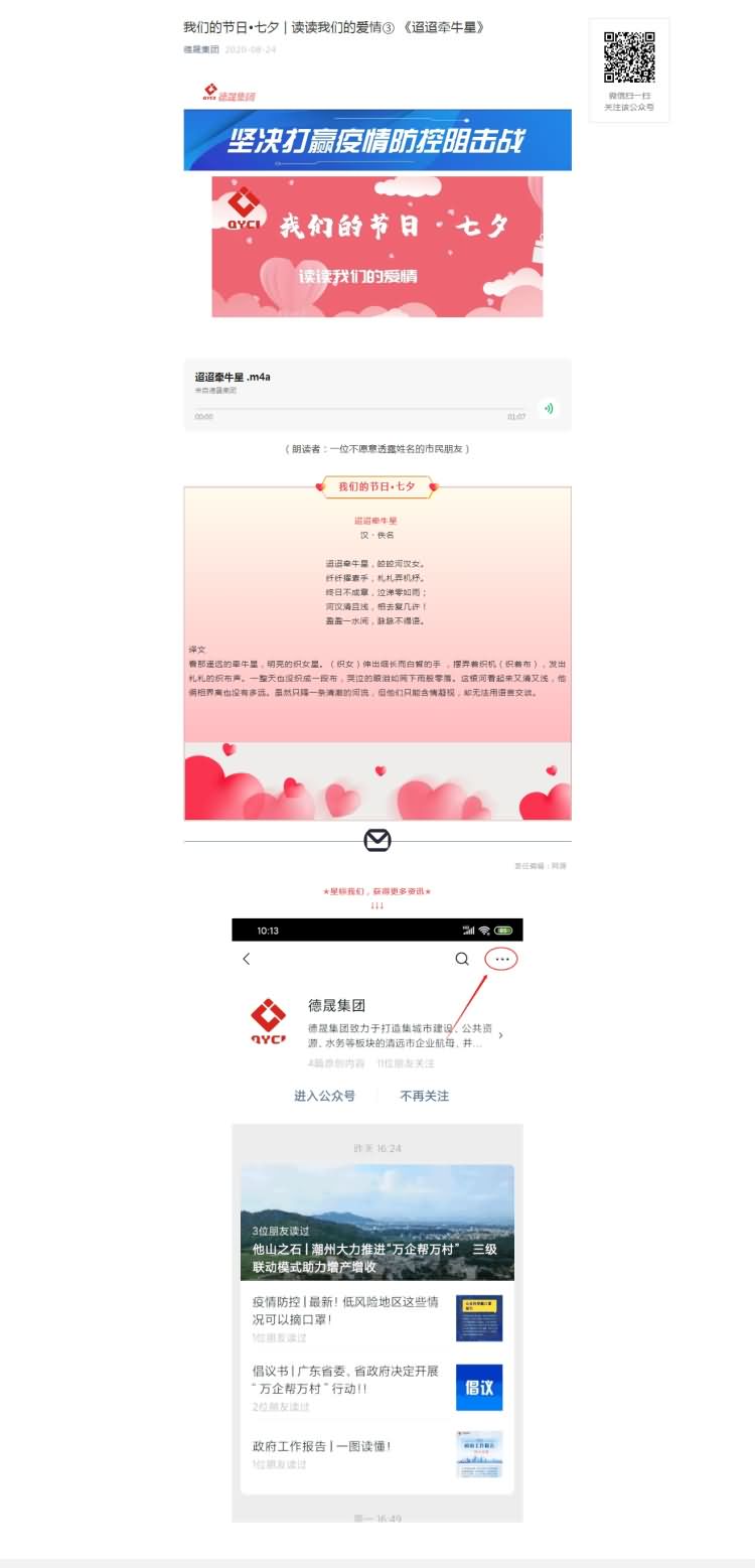 爱情诗歌,经典传颂。“我们的节日·七夕”经典爱情传颂活动,以历代名人歌颂纯洁爱情的经典爱情诗篇、千古流传的经典爱情故事、重温红色经典等,融入传统佳节的节日氛围弘扬和传承传统节日内涵,开展线上宣传和网络传颂活动。活动还邀请了员工开展“读读我们的爱情”经典诗歌线上诵读活动,诵读的作品有《相思》《传奇》《迢迢牵牛星》《望月怀远》等。通过诵读经典爱情诗篇来传颂爱情故事和传播崇尚忠贞爱情,表达朗读者向往美好幸福的美好情怀,引导员工传承中华情爱文明,讴歌纯洁爱情、诠释爱情真谛,续写高尚纯洁、忠贞不渝的爱情新故事。