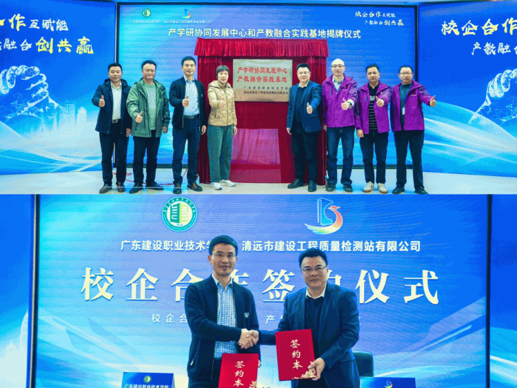 为加强校企合作,促进产教融合,提升人才培养质量,近日,广东建设职业技术学院与乐天使fun官网集团下属清远市建设工程质量检测站有限公司(以下简称“建工质检站公司”)举行校企合作签约仪式暨产学研协同发展中心和产教融合实践基地揭牌仪式。