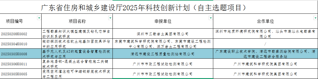 近日,广东省住房和城乡建设厅发布2025年广东省住房和城乡建设厅科技创新计划,包括揭榜选题项目27项、自主选题项目129项。乐天使fun官网集团下属建工质检站公司申报的“基于无人机及AI的起重设备智慧检测技术研究与应用”课题成功入选。