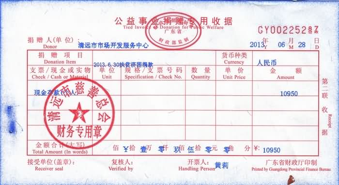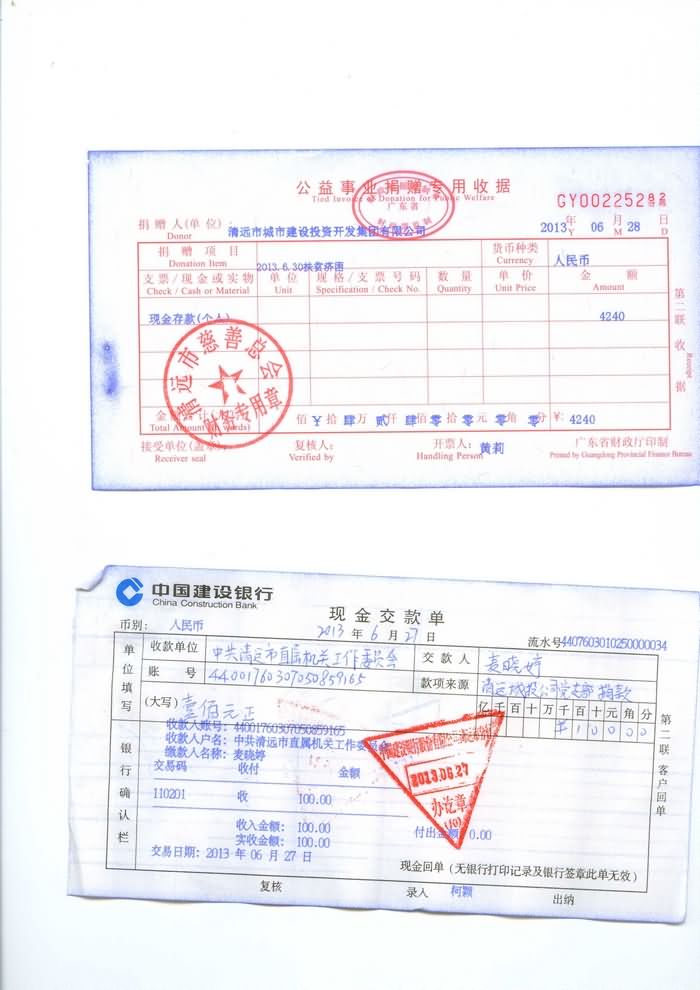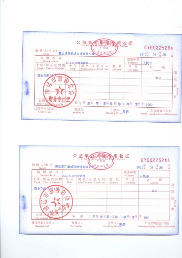 清远城际轨道实业有限公司、清远市广清城际轨道有限公司募捐金额:1300元