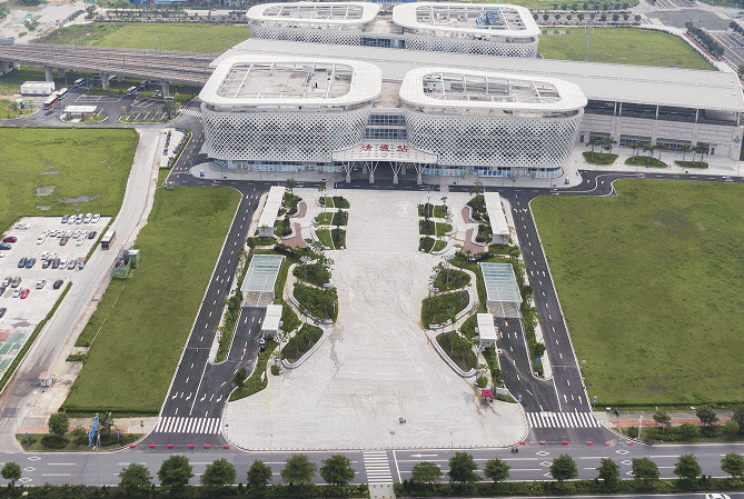广清城轨清城站综合商业体位于广清城际清城站车站站房两侧,总建筑面积90600㎡,结构为地上四层和地下两层,地上四层为商业,总建筑面积约48000㎡,分为商业1、2两栋建筑,首层均连通城际轨道车站售票厅。商业体层高超过5.2m,配置通风空调,电梯扶梯共34台,预留了燃气和电影院条件,停车位约1100个,并已安装智能停车系统。商业体是广州到清远市区首站,临近碧桂园山湖城大型住宅小区,商业潜力巨大。