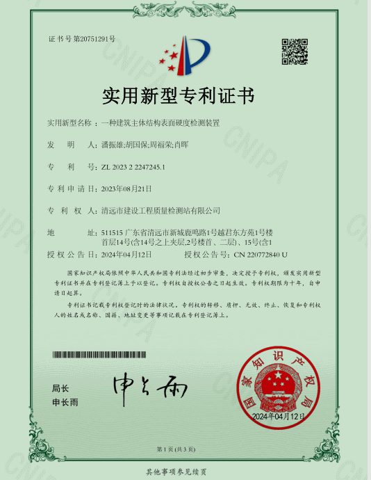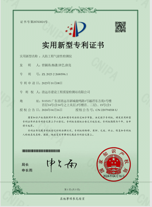 近日,由清远市建设工程质量检测站有限公司(下称“市建工质检站公司”)研发的《一种建筑主体结构表面硬度检测装置》和《人防工程气密性检测仪》获国家知识产权局颁发的实用新型专利证书,标志着市建工质检站公司工程技术研发能力取得又一重大突破。
