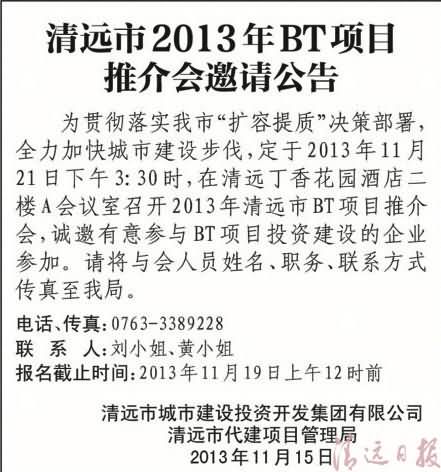 清远市2013年BT项目推介会邀请公告
